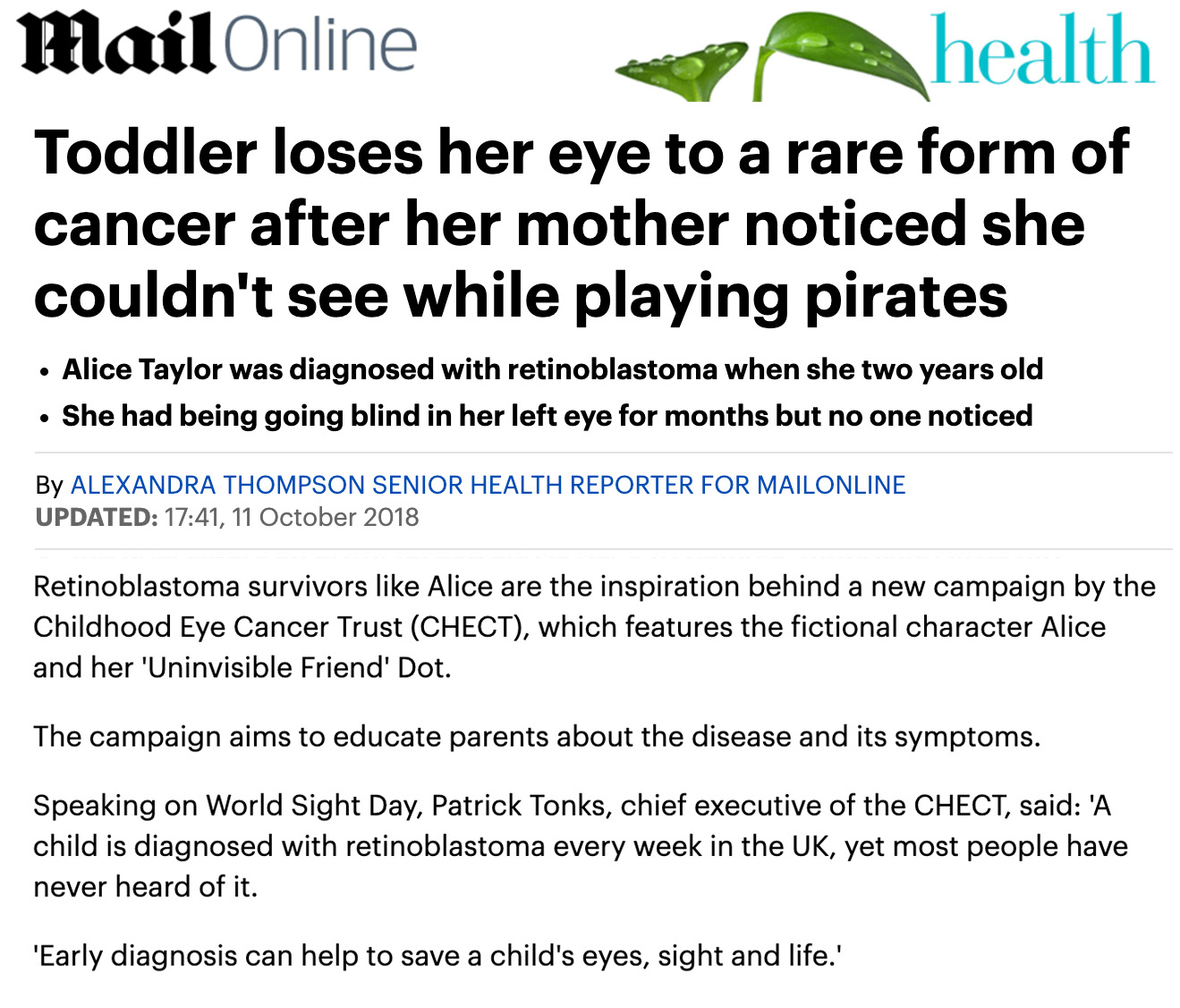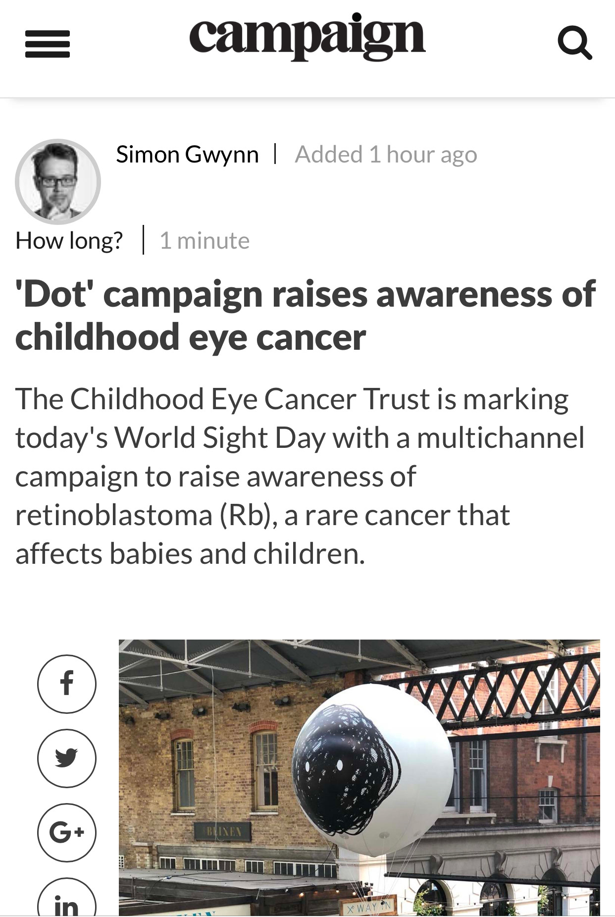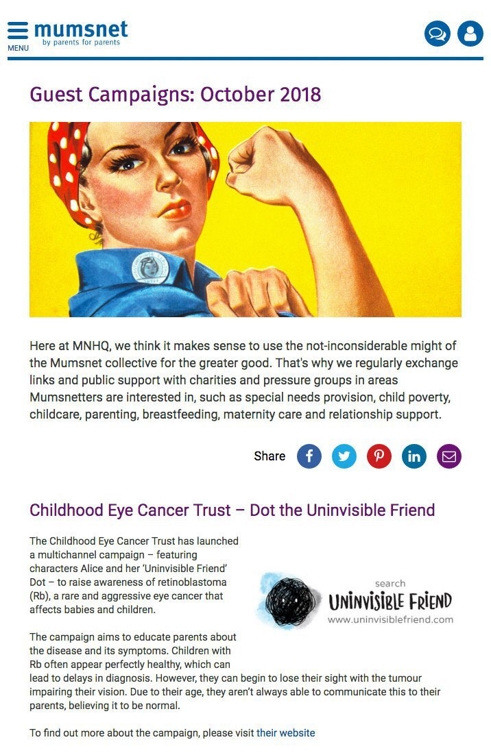 The campaign received lots of earned coverage including Mumsnet's guest campaign, a feature from Mail Online Health and The Drum's campaign of the day, making the uninvisible visible to many on World Sight Day and raising awareness of eye cancer.
