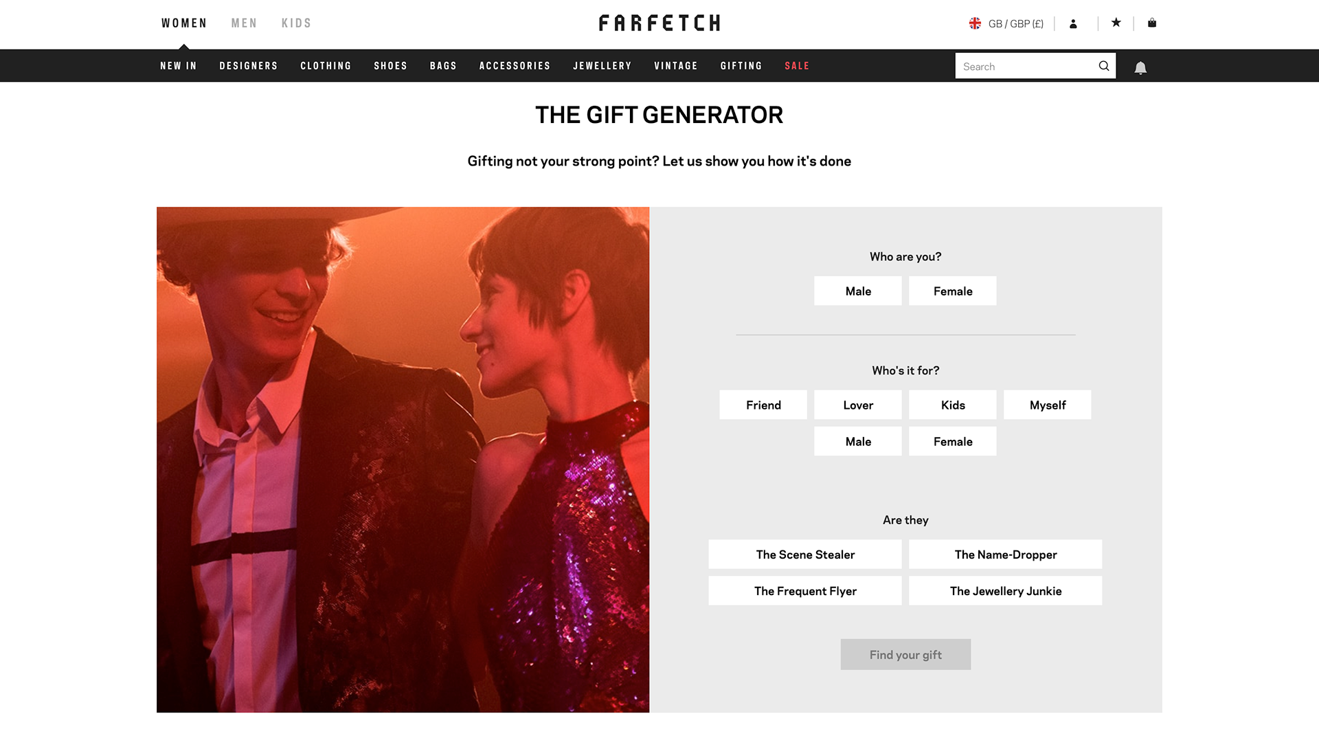 A gift generator on the Farfetch homepage helped the gifter find the perfect gift based on the unique interests and personality of the person they were buying for.