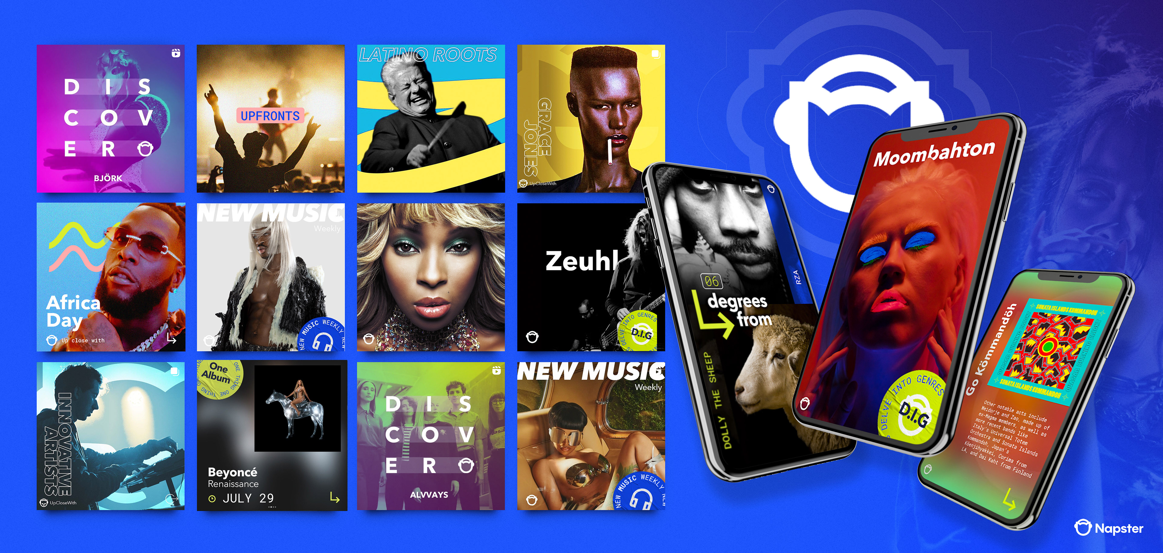 I rolled out a fresh rebrand across all of Napster's social media channels, including concepts that united and connected fans closer with the artists they know and love, a new tone of voice with artistic expression and knowledge at its core, and a revamped suite of serialised content with a vibrant art direction that put pop culture and fan experiences front and centre stage.